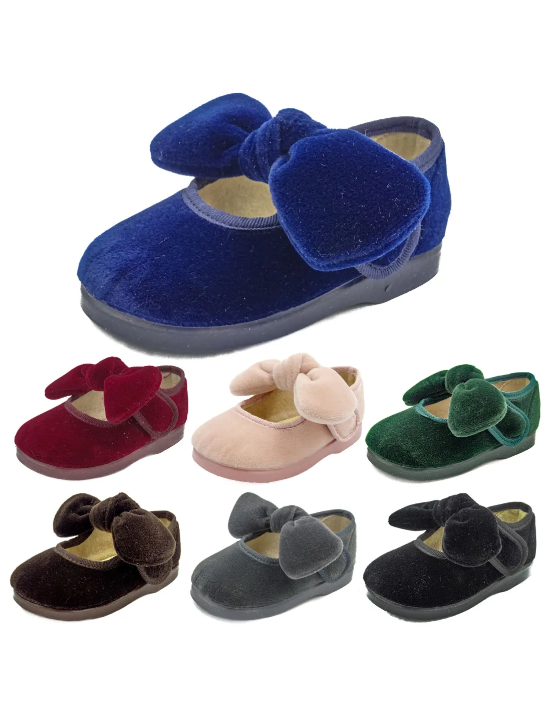 Mercedita para niña de terciopelo con cierre de velcro con un lazo en la correa que se puede quitar.